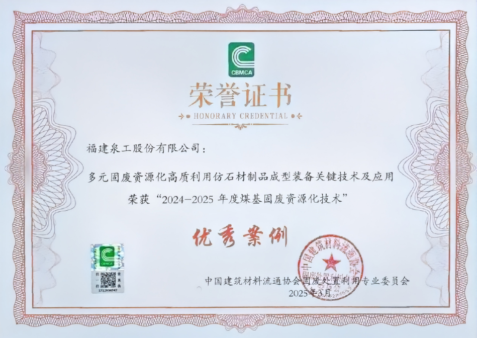 會(huì)議期間,泉工股份的“多元固廢資源化高質(zhì)利用仿石材制品成型裝備關(guān)鍵技術(shù)及應(yīng)用”案例成功榮獲2024-2025年度煤基/冶金固廢資源化技術(shù)優(yōu)秀案例。據(jù)悉,此次評(píng)選旨在表彰在固廢資源化利用領(lǐng)域具有創(chuàng)新性和示范性的技術(shù)與應(yīng)用,推動(dòng)行業(yè)規(guī)?;透咧祷l(fā)展,培育發(fā)展固廢綜合利用新質(zhì)生產(chǎn)力。